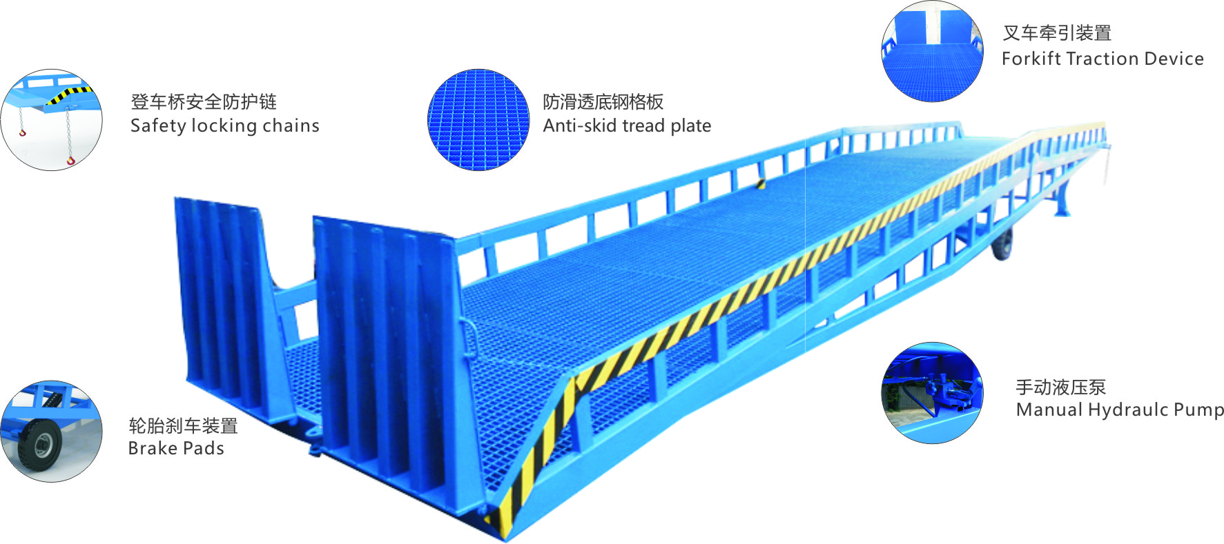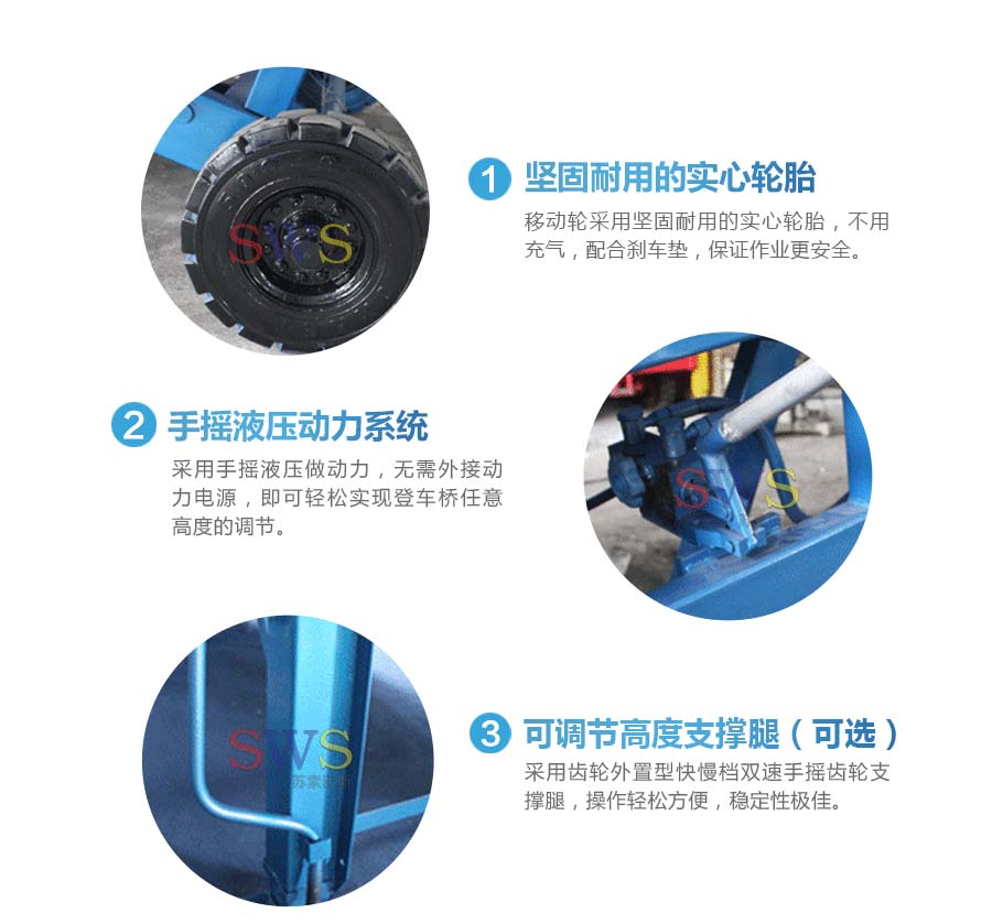 采用人工液壓動力,勿須外接動力電源即可輕松實現(xiàn)登車橋的高度調(diào)節(jié)。
