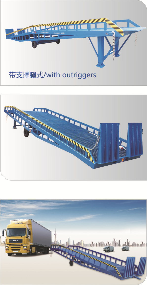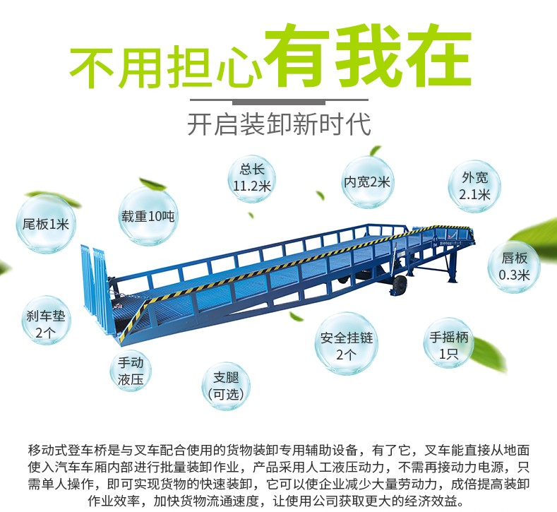 移動液壓登車橋是與叉車配合使用的貨物裝卸專用輔助設(shè)備,有了它,叉車能直接從地面進入汽車車廂內(nèi)進行裝卸貨物的作業(yè)。能夠提高貨物裝卸速度,節(jié)省裝卸工作的時間以及人力,是您裝卸貨物的得力助手。只需單人操作,不需動力電源,即可實現(xiàn)貨物的安全快速裝卸。移動式登車橋用于無裝卸設(shè)備的貨臺及流動裝卸場所,是與叉車配合使用的貨物裝卸輔助設(shè)備??筛鶕?jù)汽車車廂的高低調(diào)節(jié)高度,叉車可以直接通過本設(shè)備駛?cè)胲噹麅?nèi)部進行貨物的批量裝裝卸。